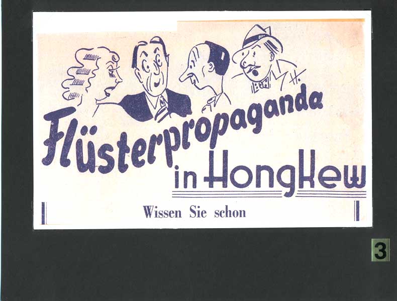 By The talent and endurance of Jewish refugees that Hitler could not take away from refugees fleeing to Shanghai as he did with their precious heirlooms, helped rebuild and transform the ruins left from the 1937 Sino-Japanese War into one flourishing store after another. In a short time, enterprising refugees from Central Europe revitalized Chusan Road, which became the commercial hub of "Little Vienna", with Viennese restaurants, bakeries, and a variety of stores. In figures one and two, we see a photograph of Chusan Road taken during the Hongkew era (courtesy, Horst Eisfelder), and again fifty years later (Photo ) respectively. Chusan Road was the place to go to learn about what people were saying about other people. It was also the street where one could hear the latest "Bonkes" (rumors), here illustrated by way of a cartoon in figure three. Gerhard Gottschalk popular comedian and administrator during the ghetto years referred to Chusan Road in one of his poems, "Wie die kleinen Kinder"