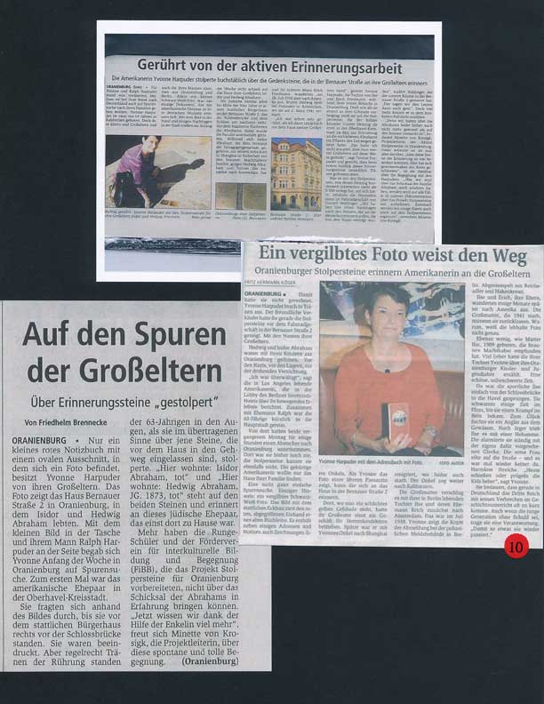 It all happened on September 25, 2006 while Yvonne Harpuder from Los Angeles, California was with her husband on a trip to Berlin and Vienna. While in Berlin, she was promised by her husband a side-trip to Oranienburg, 35 km north of Berlin, to find the house her grandparents were living in and had their store before the start of the Nazi pogroms and the infamous Kristallnacht. She had no clue how to find the building except for a very small black and white photograph that showed the exterior of the store. The photo was embossed on a little red address book she got from her aunt after her uncle passed away (Figure one). The store according to her mother sold men’s clothing and hat gear, and was situated in an impressive and stately corner building adjacent to a palace (Figure two), and a few steps from the Havel River (Figure three). Upon arrival at the train station in Oranienburg (Figure four), she showed an elderly lady shopping nearby the picture on the address book. The woman immediately recognized the area and thereafter gave Yvonne directions to the building. After a ten-minute walk, she excitedly approached the yellow, multi-story edifice, at Bernauer Strasse 2, that looked identical to the photograph on the address book (Figure five). After taking a few snapshots of the building and the front of the store, which is now a bicycle shop (Figure six), Yvonne walked inside and introduced herself to the friendly storekeeper. When she told him that this was her grandparent’s store, he asked the 62-year-old American to step outside the shop with him for a moment where he then pointed at two small brass plates embedded in the cobblestones on the sidewalk. Tears began to flow down her cheeks when she read the names of her grandparents, Isidor and Hedwig Abrahm, inscribed on the plates called “Stolpersteine” (Figure seven and Figure eight). Stolpersteine are cobblestones covered with a layer of brass and an inscription commemorating a person who used to live in the house behind the stone and had been persecuted or killed by the National Socialists. “I was overwhelmed”, she told the Oranienburger Press at the Berlin Intercontinental Hotel during an extensive interview the next day. (Figure nine). Several other local newspapers and the Internet followed the story and also began to publish her emotional experience at Bernauer Strasse (Figure ten). She has never heard about Stolpersteine, nor has been to Oranienburg. All she wanted at the time was to find the store of her grandparents, the rest was serendipity. It may be recalled that Sachsenhausen was a short distance from the mainstream of Oranienburg where in 1936 the Nazis established their first notorious concentration camp. Yvonne was told very little by her mother, Ilse about life in Oranienburg during the Nazi period. Instead she spoke about the more carefree and happy days during her early youth while living in that city. One of the highlights she often mentioned was when as an athletic teenager she jumped off from a bridge into the Havel River already mentioned above. A cramp in her leg almost caused her to drown when luckily a fisherman pulled her out from the water. Yvonne remembered her mother’s story well while standing at that same bridge during her visit to Oranienburg (Figure11). She also remembered the palace that her mother spoke about when she was alive (Please refer back to Figure three). Both the bridge and the palace were untouched during all those years. Looking back in years, it was 1938 when it was time to leave Germany because of the Nazi dreadful policies against Jews. Yvonne’s grandmother, Hedwig managed to leave with her children in 1938 to Amsterdam. A form had to be completed and submitted to the Nazi authorities before they left, stating the move from Germany to Amsterdam, and their religious affiliation which was crassly indicated, “Jude”. It was then cancelled with the Swastika and Nazi eagle (Figure 12). Later that year Hedwig failed to secure a visa to America and therefore, had to remain in Amsterdam while her children (Yvonne’s parents) continued with their emigration to America. Yvonne’s grandfather, Isidor immigrated with his son to Shanghai. The son’s address in Shanghai along with Hedwig’s address in Amsterdam is shown on the same page in the little red address book mentioned above (Figure 13). Yvonne’s grandmother, Hedwig died in Amsterdam at an unknown date. Isidor, Yvonne’s grandfather, survived the war but died shortly after in February 1946 while he was still in Shanghai (Figure 14). How did Oranienburg get its Stolperstein? The best way to answer this question is to quote part of a letter written in German that yours truly received from a high school teacher in Oranienburg by the name of Silke Schroeder (Figure 15): “When I had the opportunity to address the parent-teacher association at the Rungegymnasium in Oranienburg where I am a teacher and my son a student, I made a suggestion to raise money for a Stolperstein in our city by having a bake sale. The parents and students agreed, hence the children and mothers began to bake thirty delicious cakes that were sold to everyone in the school. When I came to the school in the afternoon, all the students were very enthusiastically involved with the project. A few gathered the crumbs from the cake while the other students counted the money from the bake sale. It was something for everyone to see. Yes, we have reached our goal and thus we had enough money for a Stolperstein. On May 10, 2006 Guenter Demnig laid the brass plated cobblestone into the pavement at Bernauer Strasse (in front of Yvonne’s former grand-parents store). All the students including the school principal took part in the ceremony. Now, the name Hedwig and Isidor Abraham will be remembered by the students that participated in this meaningful undertaking.”