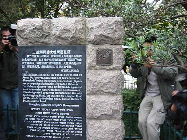 The dignitaries stood shoulder to shoulder in the still warm sun on a stage set up in the courtyard of the Ohel Rachel synagogue. It was a festive occasion, this morning on November 10 in Shanghai. The stage with a blue backdrop declared "Jewish Refugees in Shanghai and Exhibition of Noah's Ark on Fire and Sword" It was the opening ceremony to commemorate the 60th anniversity of the end of World War II.